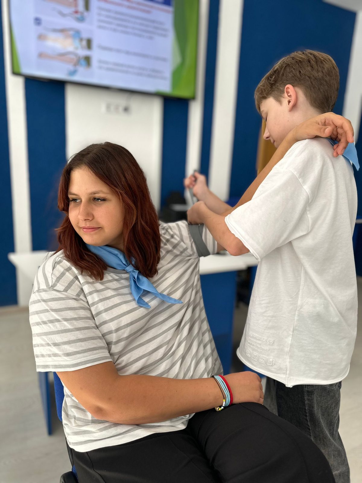 Врач СМП (выездной бригады) УЗ «Городская станция скорой медицинской помощи» подстанции № 9 Ольга Юрьевна провела для учащихся смены «Наследие предков» семинар на тему «Безопасное поведение и оказание первой медицинской помощи при возникновении чрезвычайных ситуаций (происшествий) природного или техногенного характера: ураганы, утопления, пожары, происшествия, связанные с сезонными погодными условиями, дорожно-транспортные происшествия» с отработкой практических навыков оказания первой медицинской помощи.