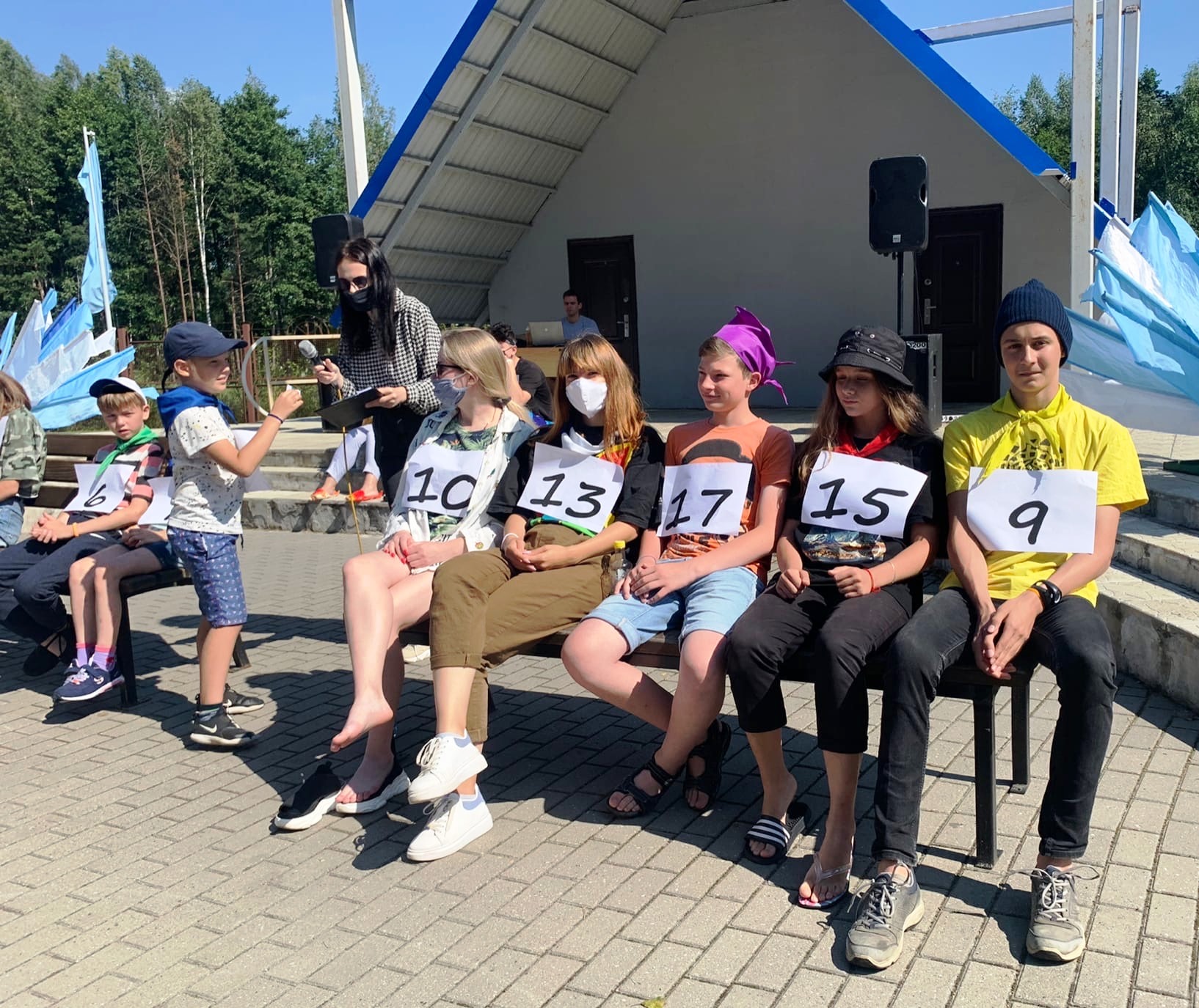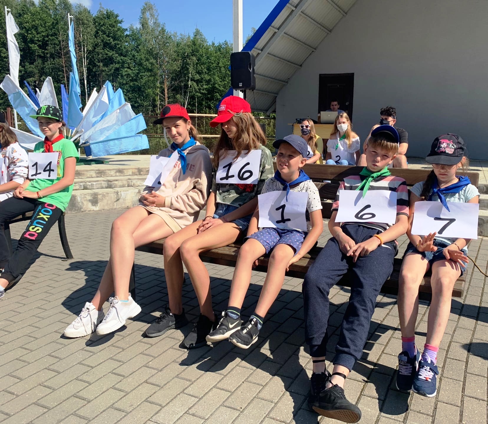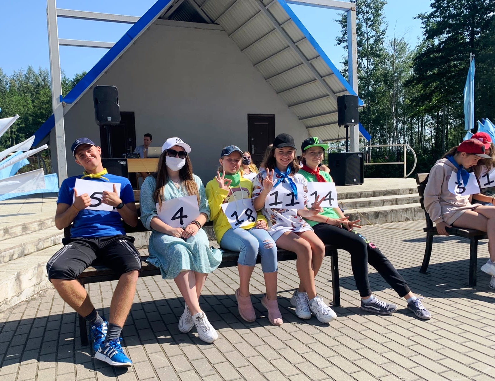 Перед командами на подиуме находятся 18 человек ребята и воспитатели из каждого отряда.