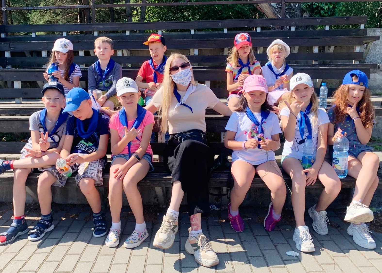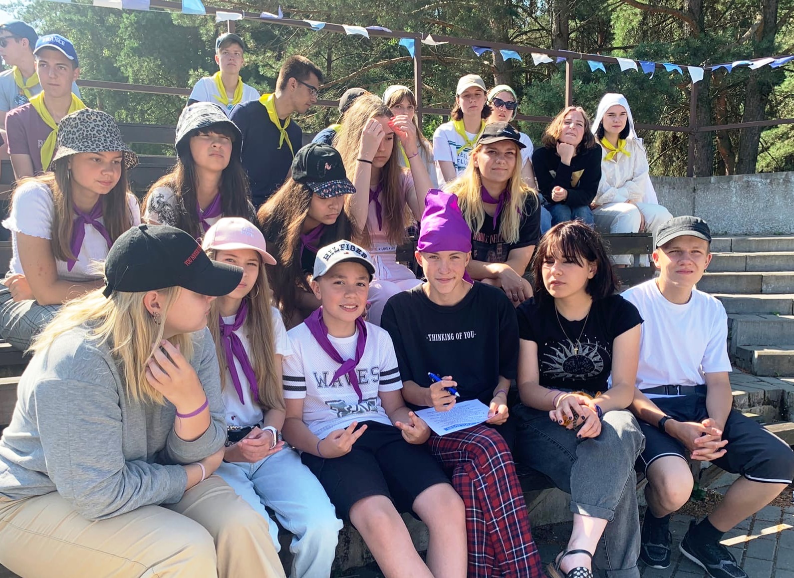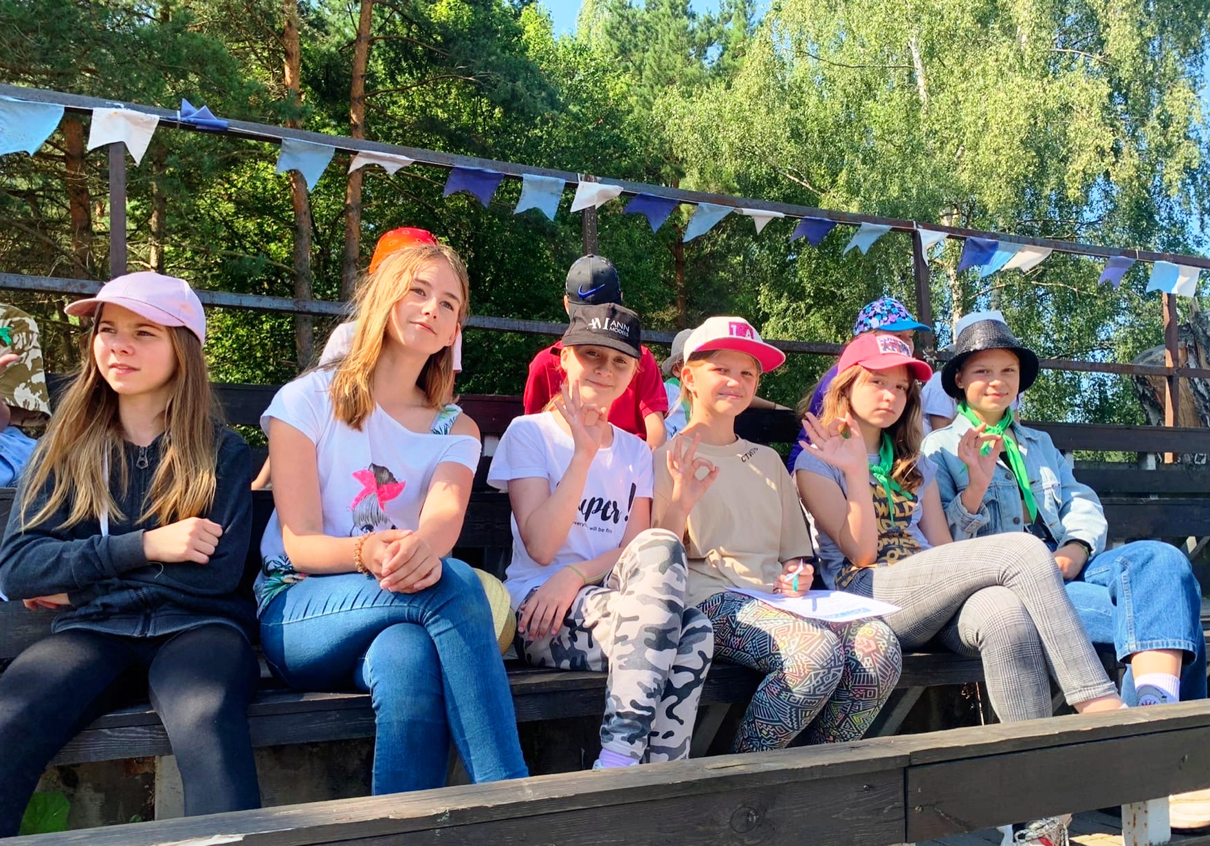 Перед командами на подиуме находятся 18 человек ребята и воспитатели из каждого отряда.