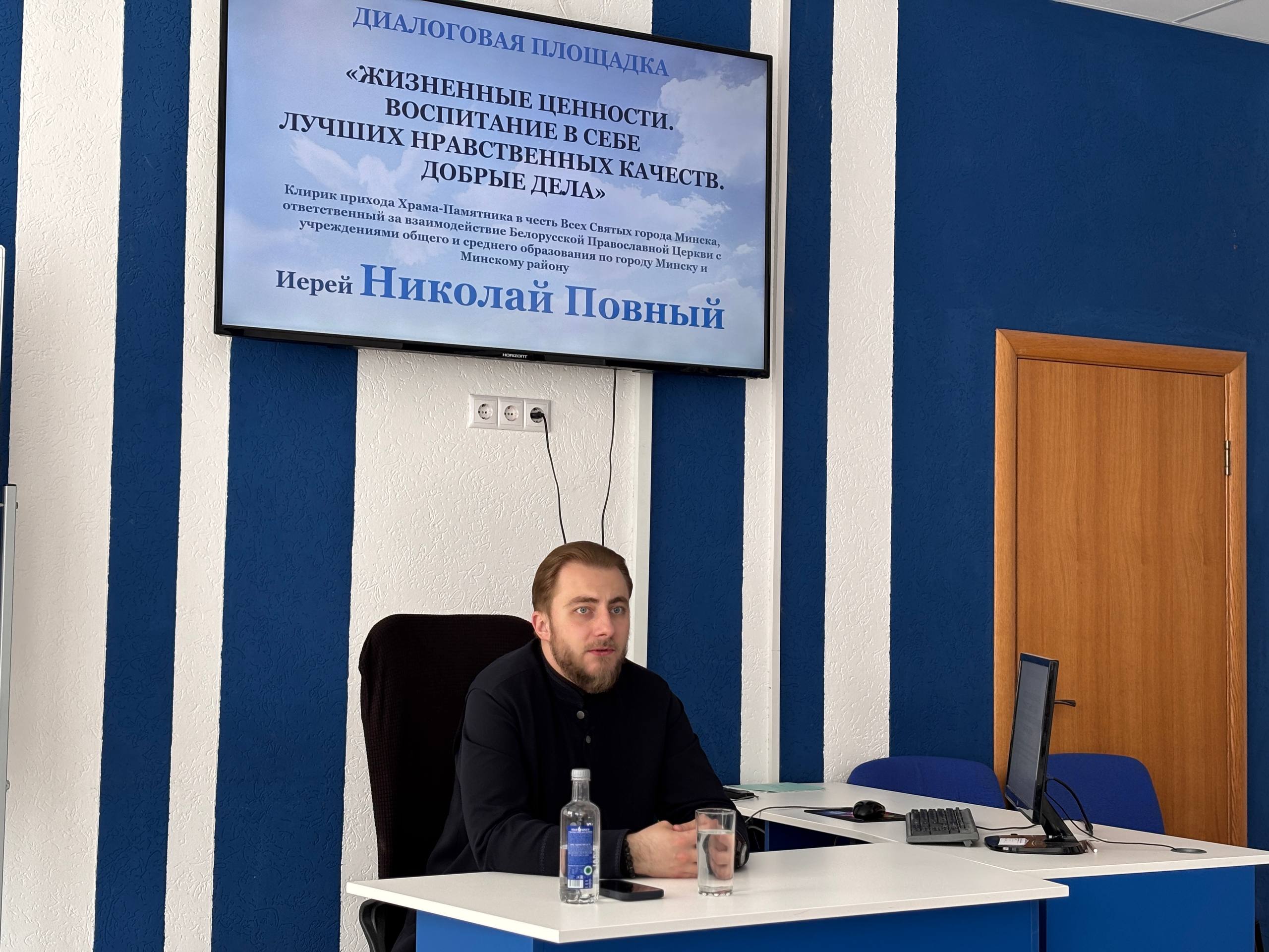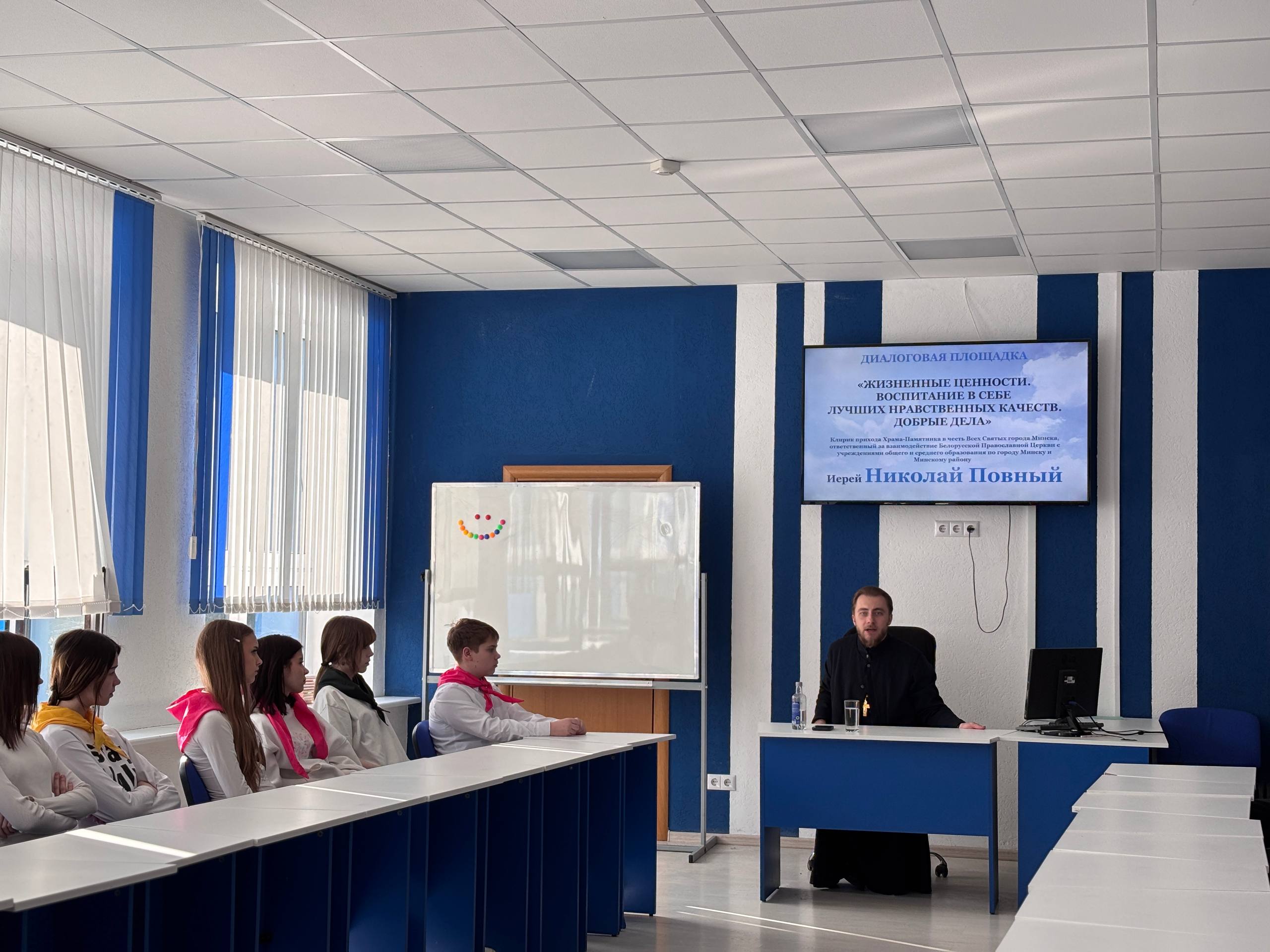В центре «Лидер» прошла встреча учащихся с иереем Николаем Повным – клириком Храма‑Памятника в честь Всех Святых, ответственным за взаимодействие Белорусской Православной Церкви с учреждениями общего и среднего образования Минска и Минского района.