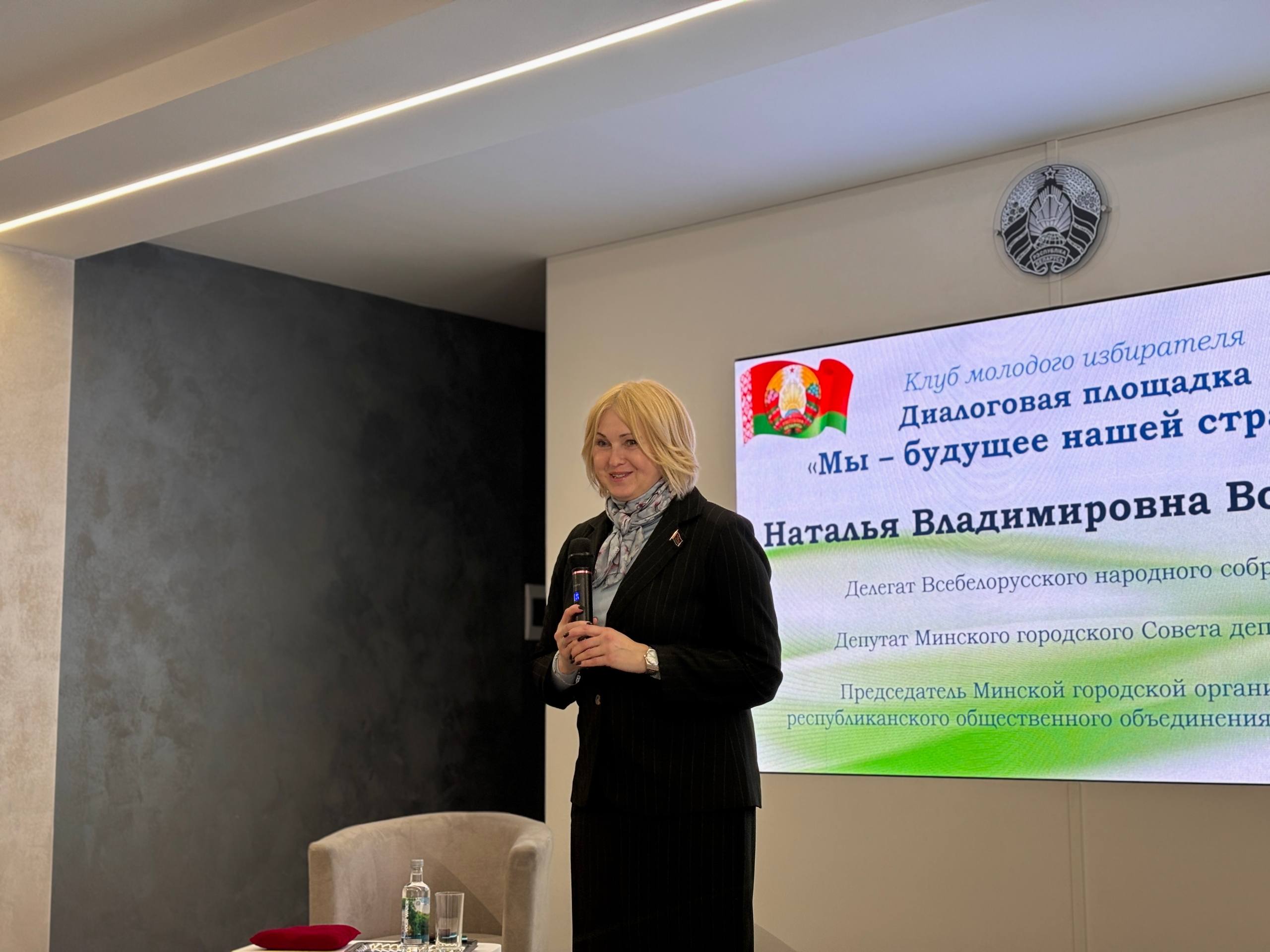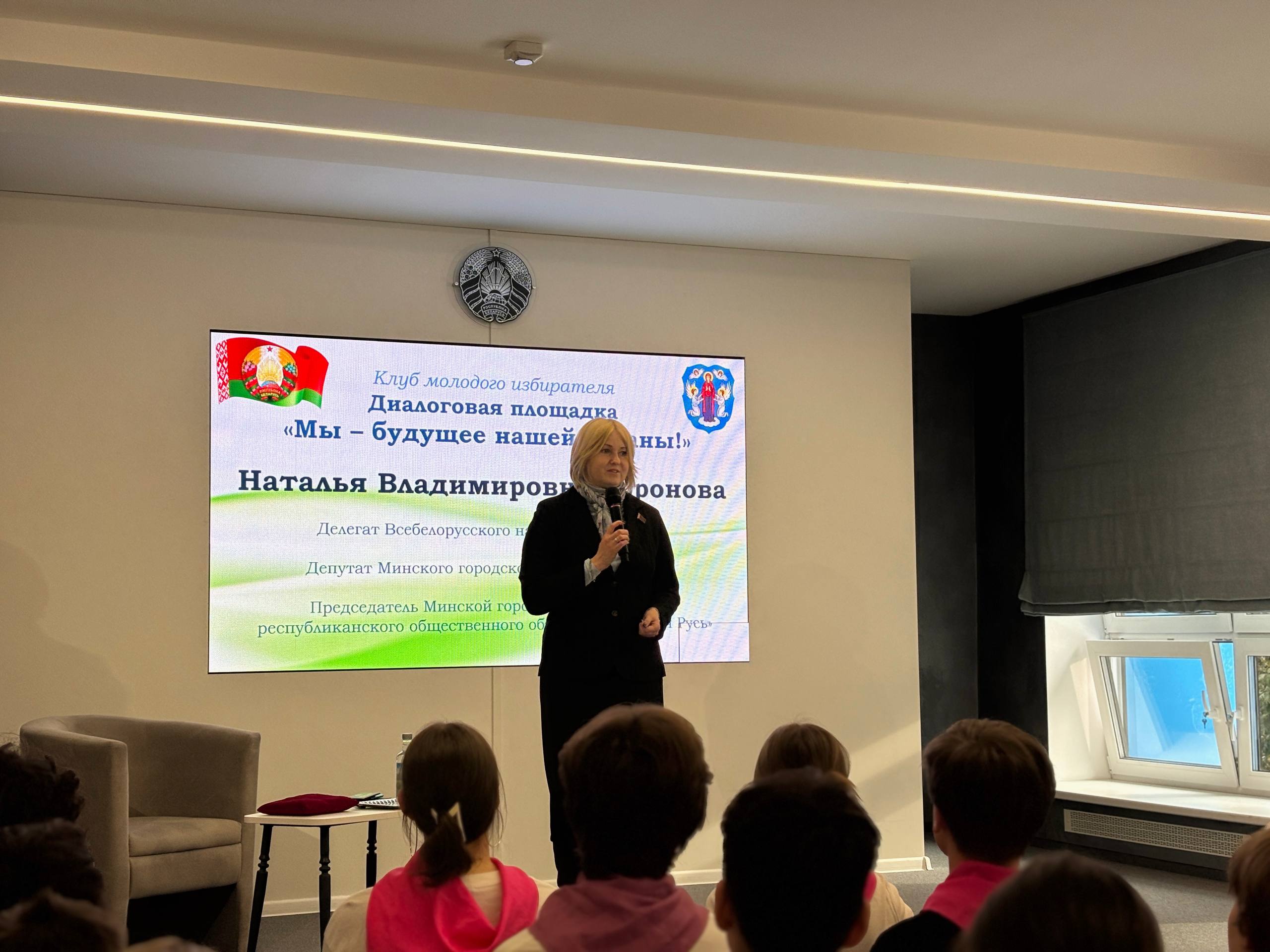 В рамках заседания Клуба молодого избирателя прошла диалоговая площадка «Мы – будущее нашей страны». Мероприятие стало пространством для откровенного разговора молодёжи с представителем городской власти – человеком, чьё имя прочно связано с активной гражданской позицией и многолетней работой на благо общества – Натальей Владимировной Вороновой, которая совмещает целый ряд ответственных должностей: является делегатом Всебелорусского народного собрания, депутатом Минского городского Совета депутатов, членом постоянной комиссии Совета по связям с общественными организациями, молодёжной политике и работе со СМИ, председателем Минской городской организации республиканского общественного объединения «Белая Русь», а также членом Белорусской партии «Белая Русь».