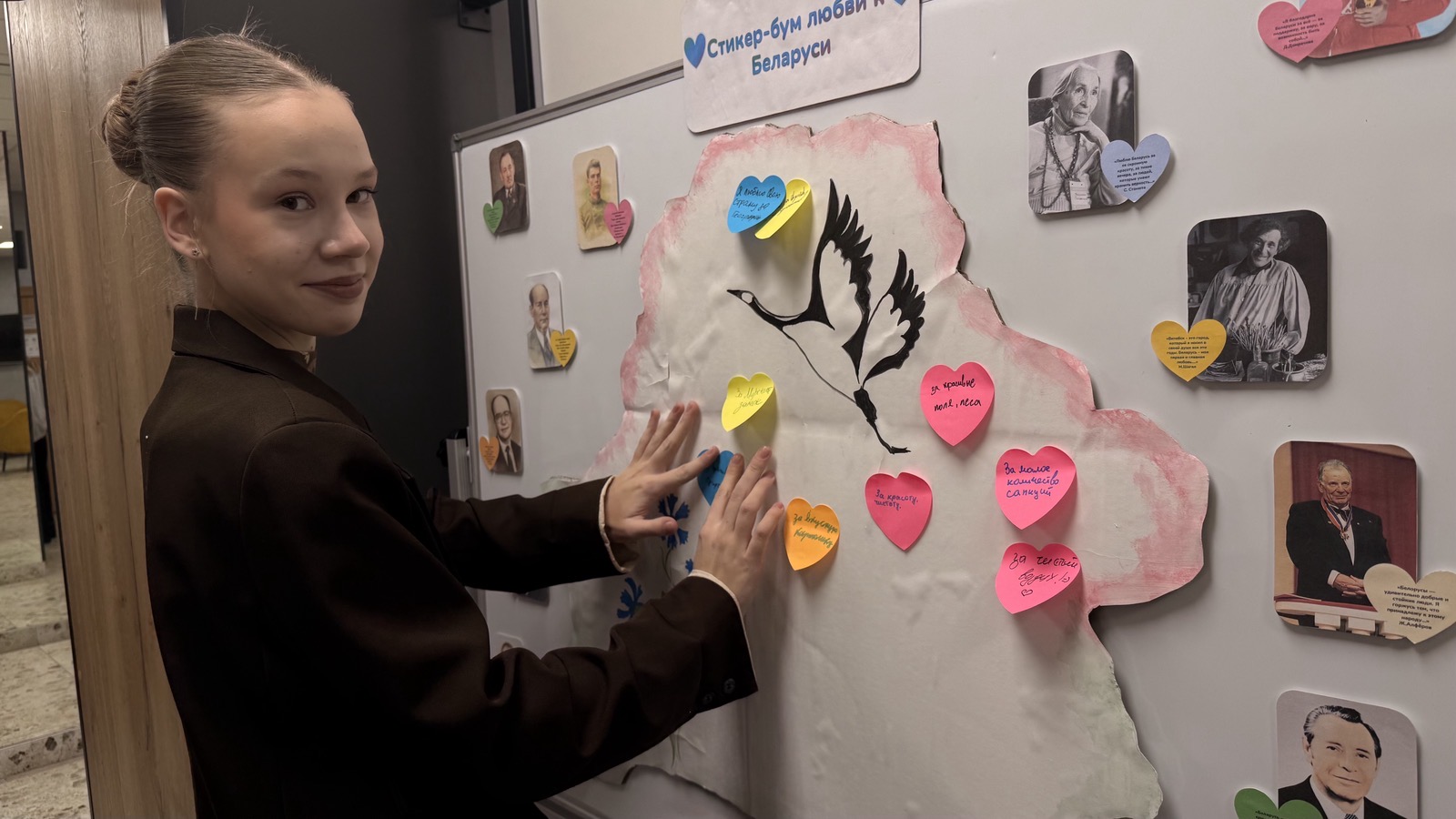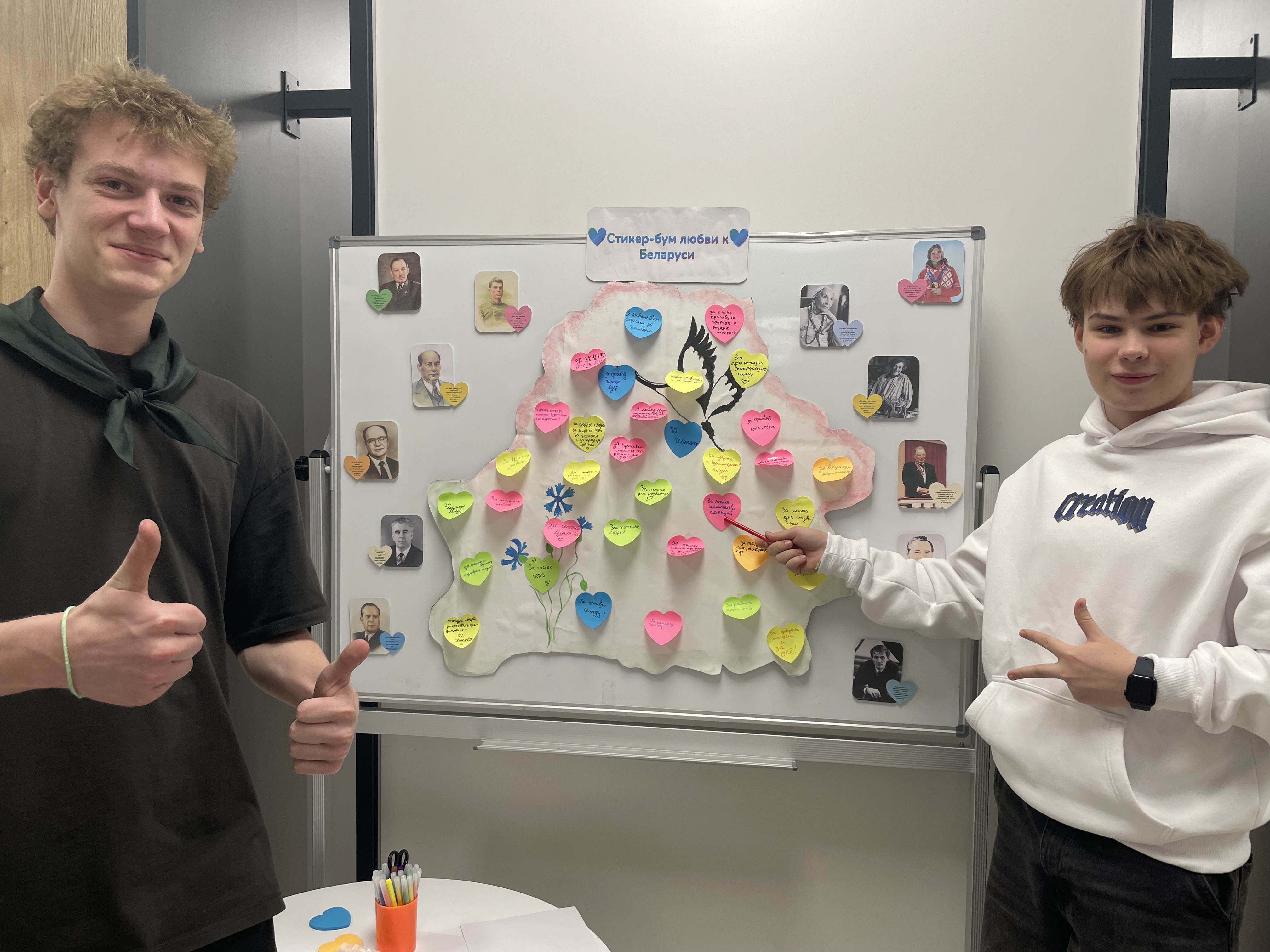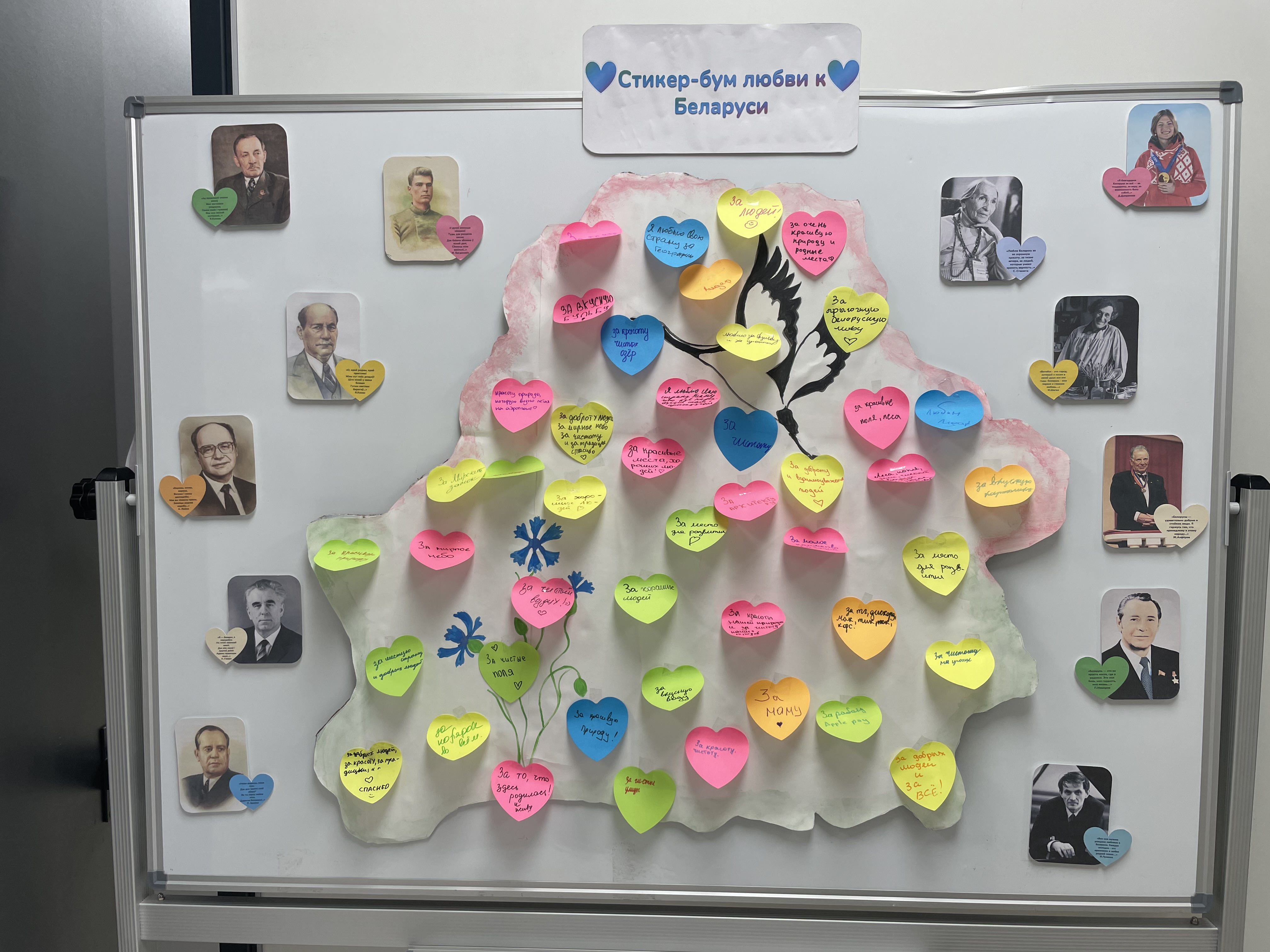 В рамках мероприятия ребята приняли участие в творческой акции, в ходе которой каждый участник заполнял стикер, отвечая на вопрос: «За что я люблю Беларусь?», и прикреплял его к карте, тем самым создавая коллективный визуальный образ любви к Родине. Мероприятие способствовало развитию у учащихся эмоциональной отзывчивости, способности к самовыражению, а также укреплению чувства национальной идентичности. Дополнительно учащиеся могли познакомиться с высказываниями известных белорусских деятелей, размещёнными на доске рядом с их портретами, что позволило детям соотнести свои чувства с примерами исторического и культурного патриотизма.