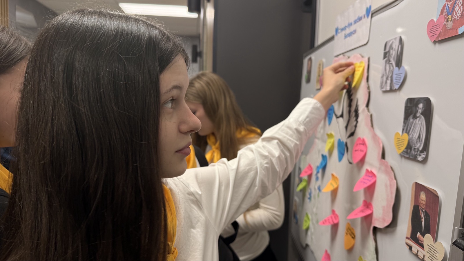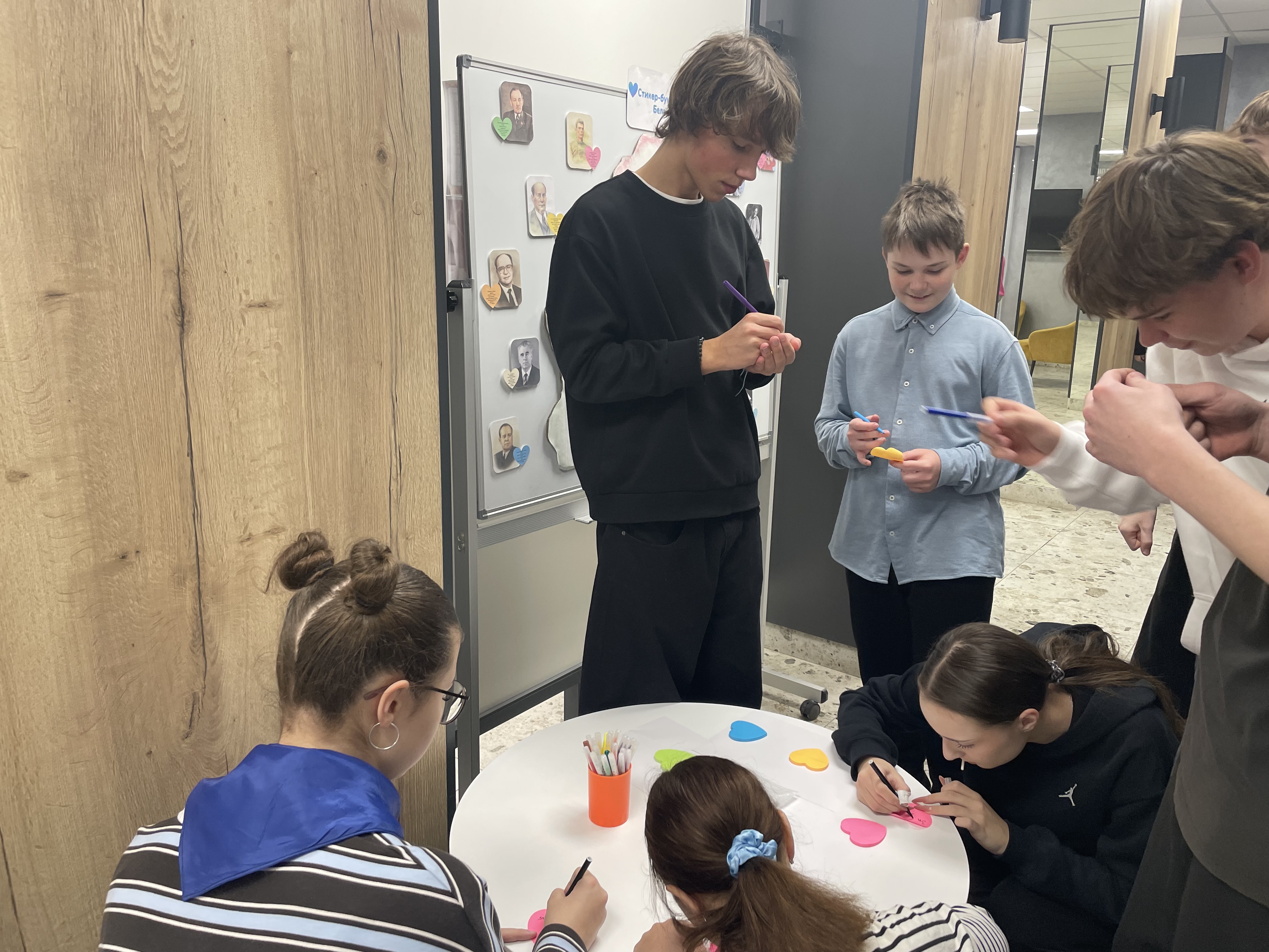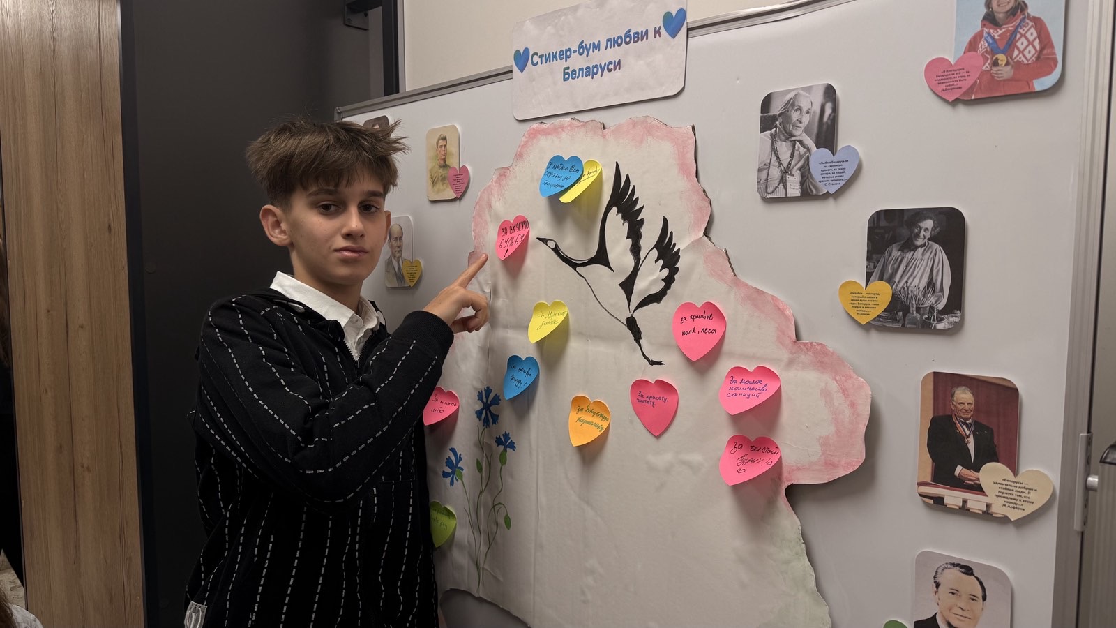 В рамках мероприятия ребята приняли участие в творческой акции, в ходе которой каждый участник заполнял стикер, отвечая на вопрос: «За что я люблю Беларусь?», и прикреплял его к карте, тем самым создавая коллективный визуальный образ любви к Родине. Мероприятие способствовало развитию у учащихся эмоциональной отзывчивости, способности к самовыражению, а также укреплению чувства национальной идентичности. Дополнительно учащиеся могли познакомиться с высказываниями известных белорусских деятелей, размещёнными на доске рядом с их портретами, что позволило детям соотнести свои чувства с примерами исторического и культурного патриотизма.