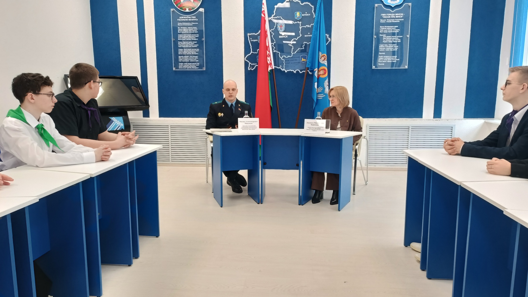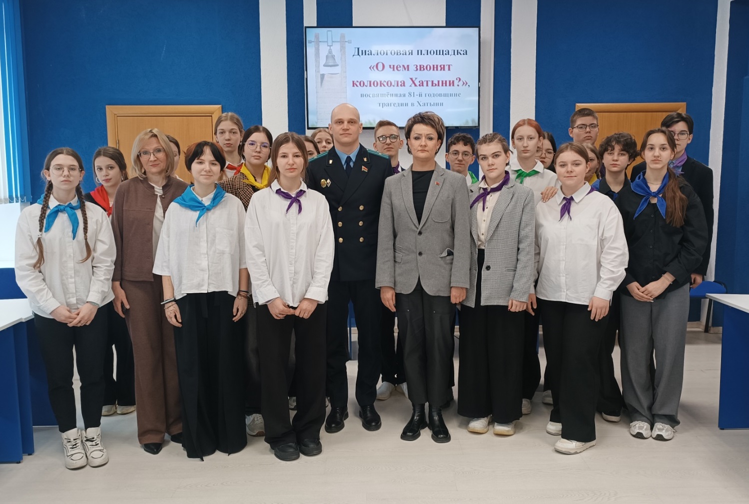 22 марта 2024 года в Минском городском образовательно-оздоровительном центре «Лидер» состоялась диалоговая площадка «О чём звонят колокола Хатыни?». В мероприятии приняли участие Людмила Михайловна Борисенко - первый заместитель председателя комитета по образованию Минского городского исполнительного комитета, Михаил Александрович Мануилов – начальник отдела по надзору за исполнением законодательства о несовершеннолетних и молодежи прокуратуры города Минска и учащиеся центра.
