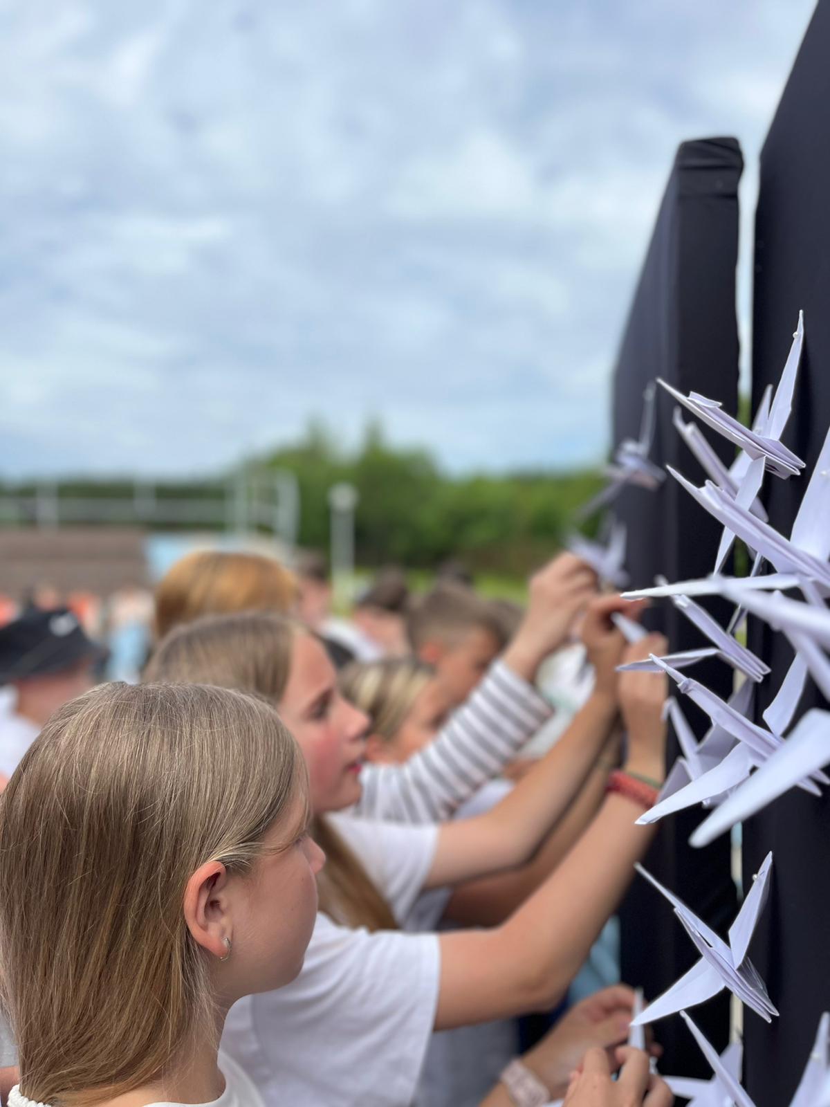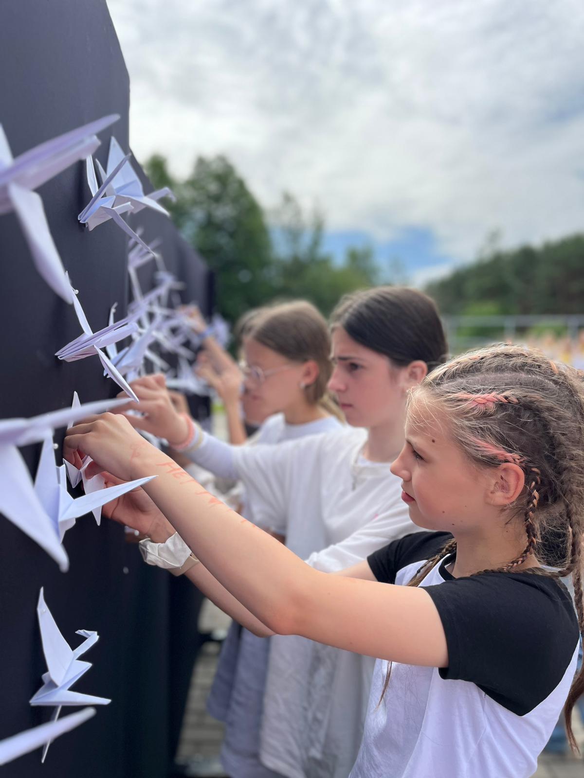 В завершение участники почтили минутой молчания память всех, кто не вернулся с войны, тех, кто защищал нашу родину от фашизма, после чего сформировали симоволический журавлиный клин из белоснежных бумажных птиц, которые ребята сделали своими руками.